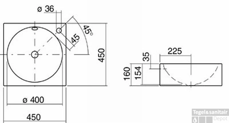 Wastafel 45×45 cm. vierkant 16 cm. hoog
