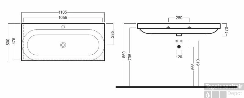 Wastafel 110.5×50 cm. met kraangat en overloop