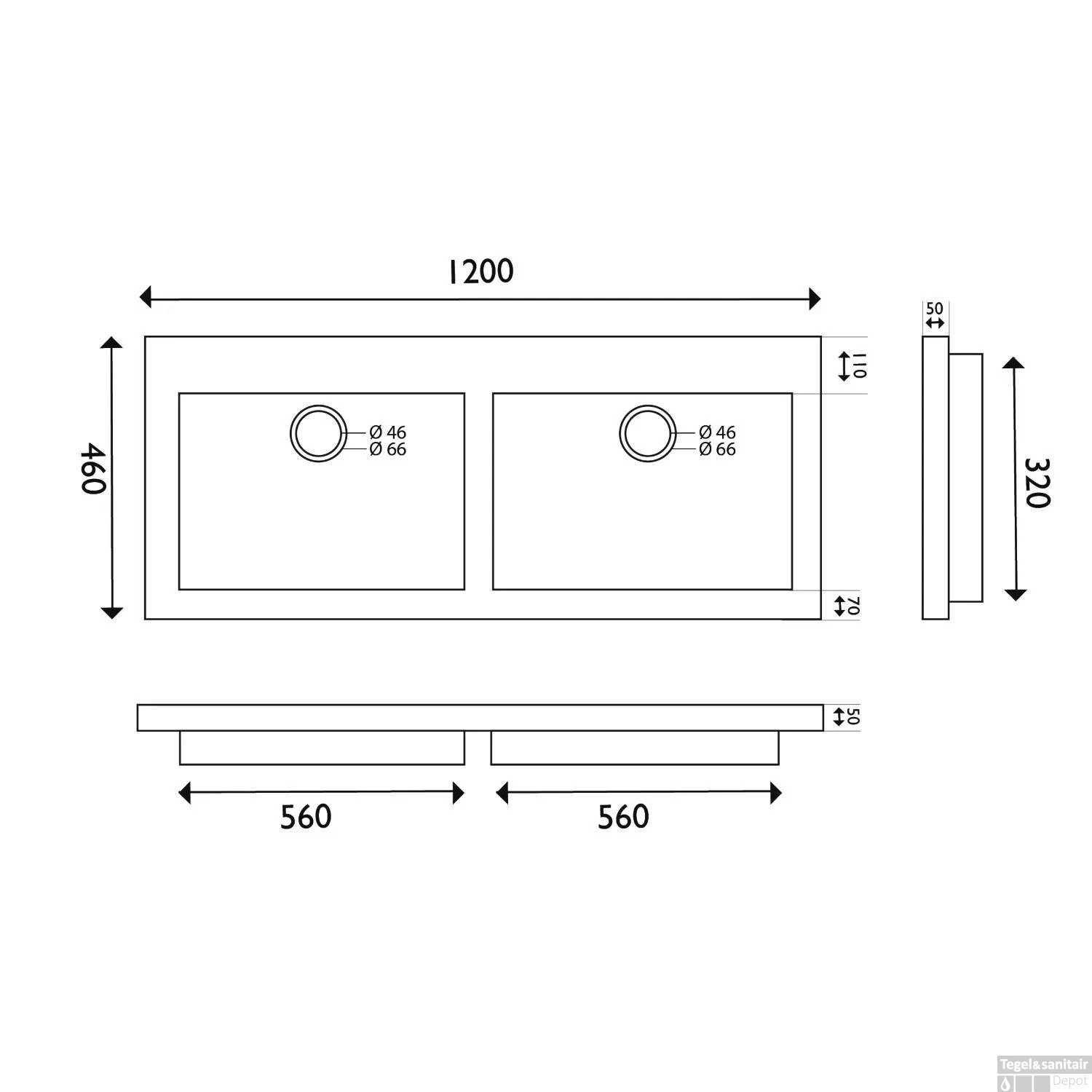 Deze dubbele wastafel kunt u niet zo aan de muur ophangen. Daarvoor moeten beugels of een onderkast onder gehangen worden. De wastafel is 120 cm breed, 46 cm diep en 5 cm hoog en heeft 0 kraangaten.