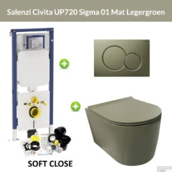 Een complete toiletset met een eenvoudig te monteren Geberit inbouwreservoir UP720 (sigma). De set is voorzien van een Salenzi Civita wandcloset in het mat legergroen en een mooi bijpassende drukplaat uit de Sigma serie. De set wordt geleverd inclusief toiletzitting met softclose systeem. Ook zit er een isolatiemat bij met steunbussen en een montageset voor het compleet afmonteren van uw toiletset.