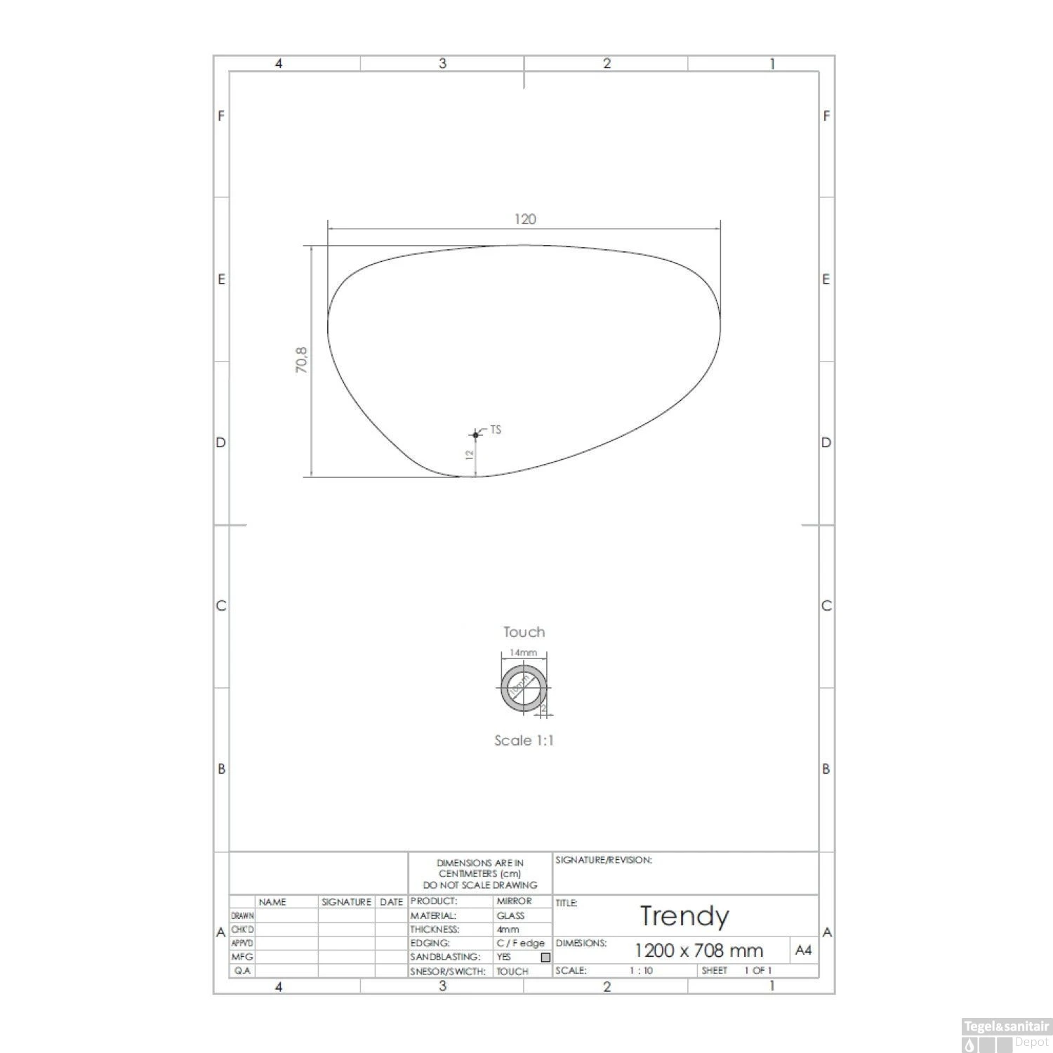De spiegel is 120 cm breed, heeft een hoogte van 70.8 cm en een glasdikte van 4 mm. Verder bevat de spiegel een touch knop waarmee u de verlichting eenvoudig kunt bedienen en een knop voor spiegelverwarming.