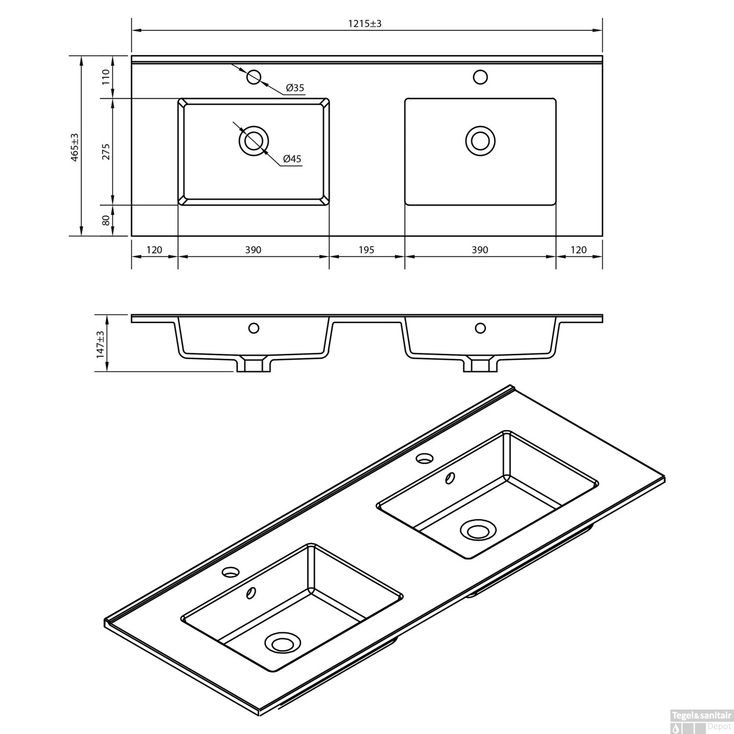 Specificaties Wastafel Differnz Hilde 121.5×46.5cm Hoogglans Wit