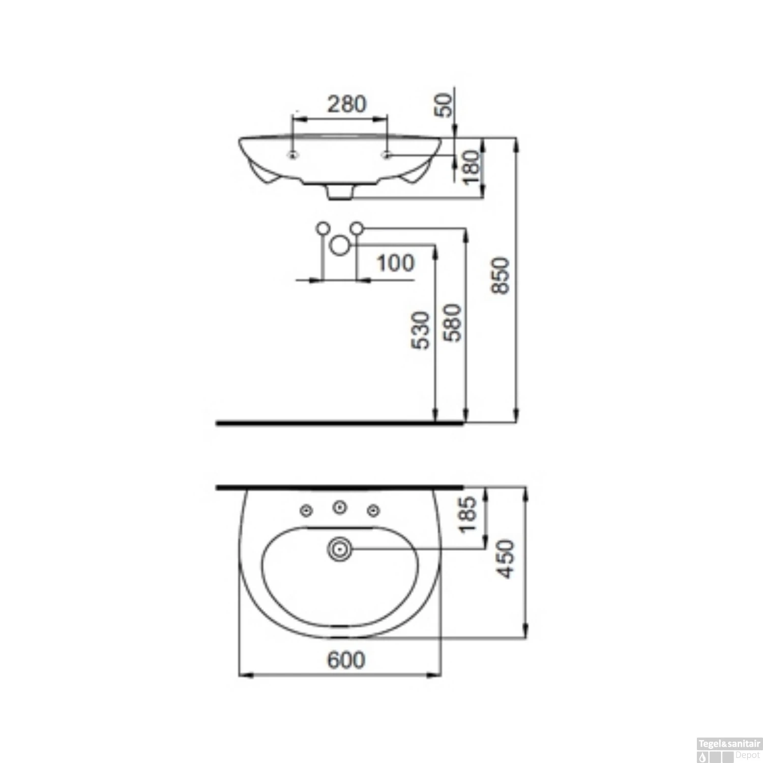 De diepte van de wastafel is 46 cm, de breedte is 60 cm en de hoogte is 18 cm.