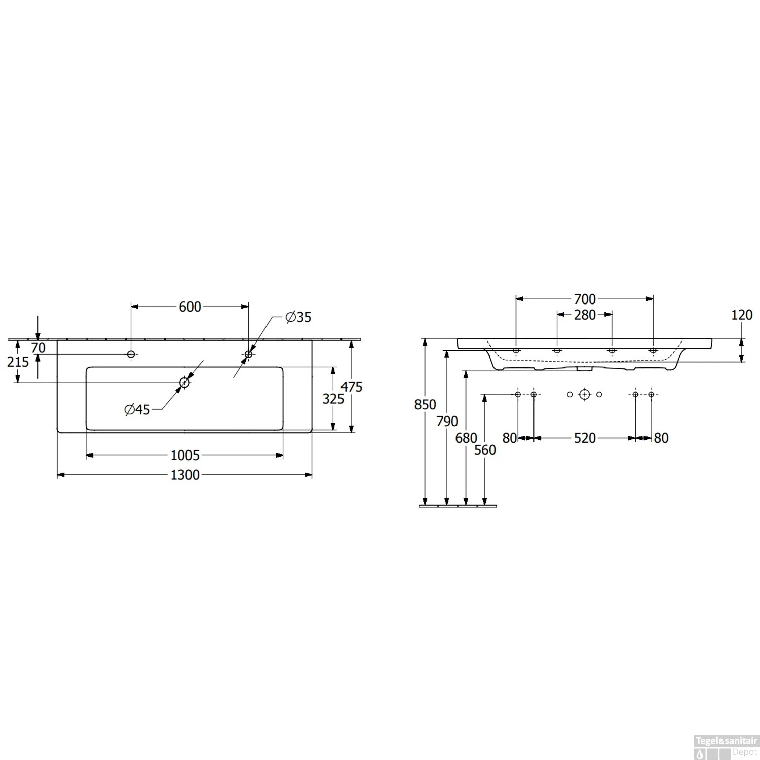 Er zijn 2 kraangaten en de diameter van het afvoergat is 4.6 cm. De kraangaten zitten links en rechts en de wastafel is gemaakt van TitanCeram. Dat is net zo goed en duurzaam als sanitairkeramiek maar is nog steviger waardoor het bestand is tegen alle belastingen.