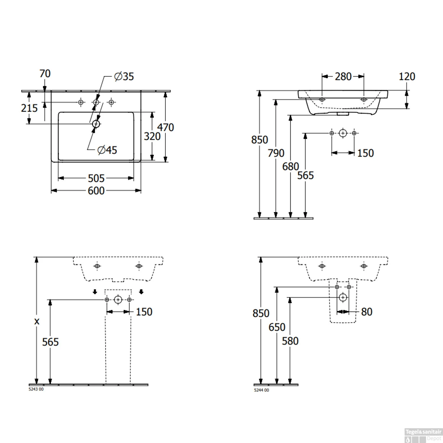 Specificaties Wastafel Villeroy & Boch Subway 3.0 47x60x16.5 cm Wit Alpin