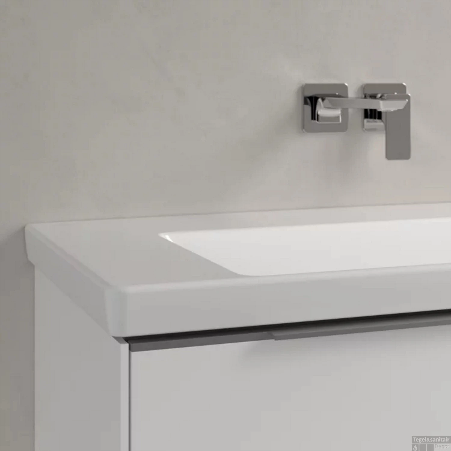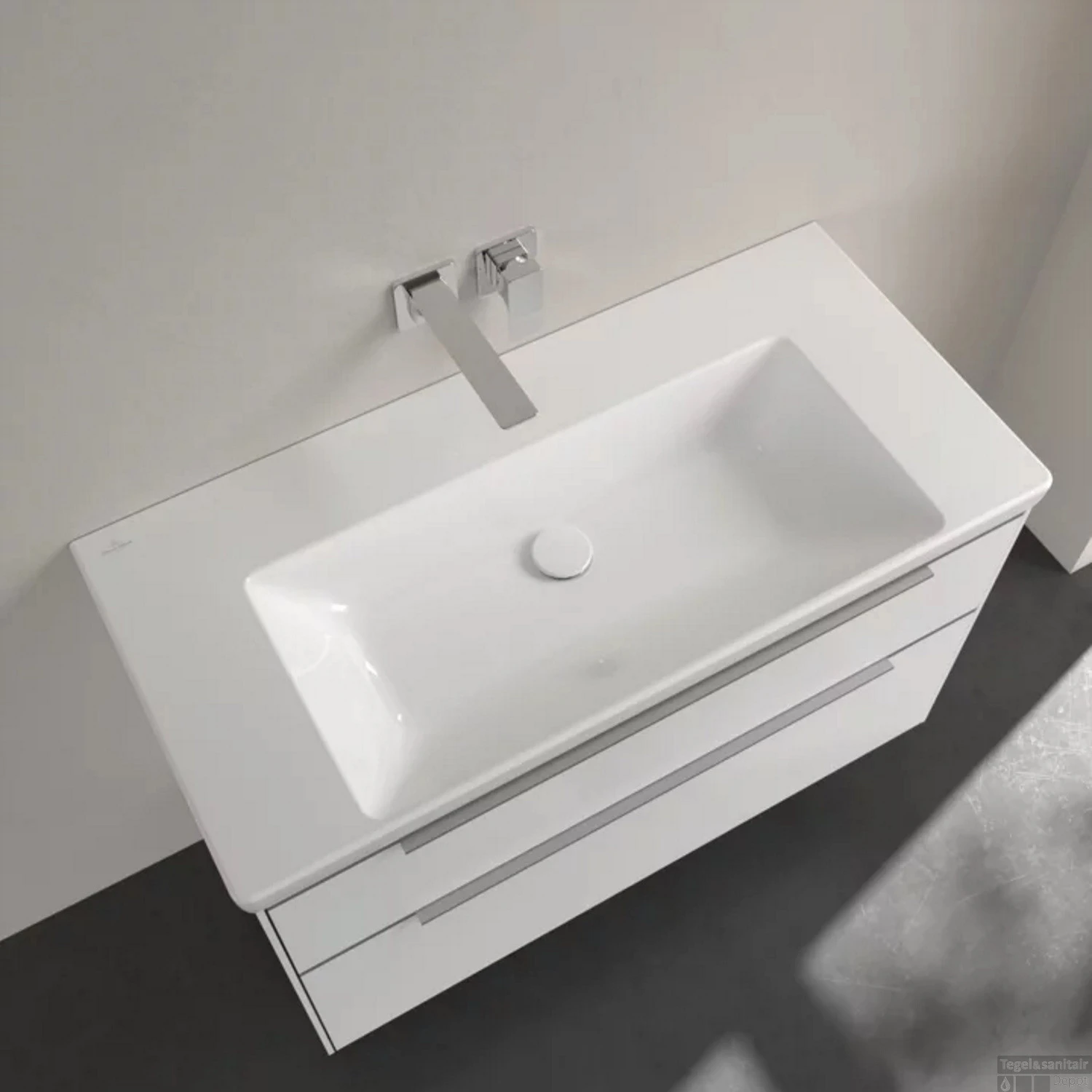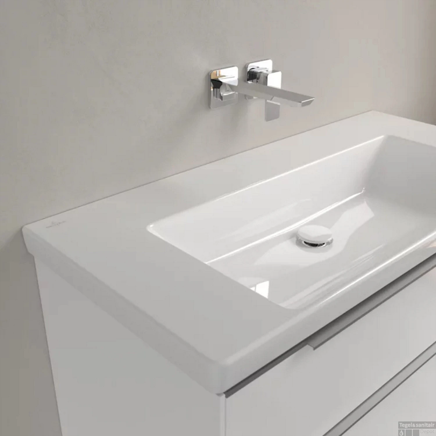 Een moderne rechthoekige wastafel die door zijn tijdloze uiterlijk in elke badkamer past. Het is 100 cm breed, 47 cm diep en 16.5 cm hoog en is gemaakt van TitanCeram. Dat is een duurzaam materiaal dat door Villeroy & Boch zelf wordt gecreëerd door verschillende grondstoffen te versmelten. Het is extra stevig waardoor de wasbak lang mee gaat. Op de brede kranenbank en randen aan de zijkant past makkelijk een zeepdispenser. Ook is er genoeg ruimte is om de handen te wassen.