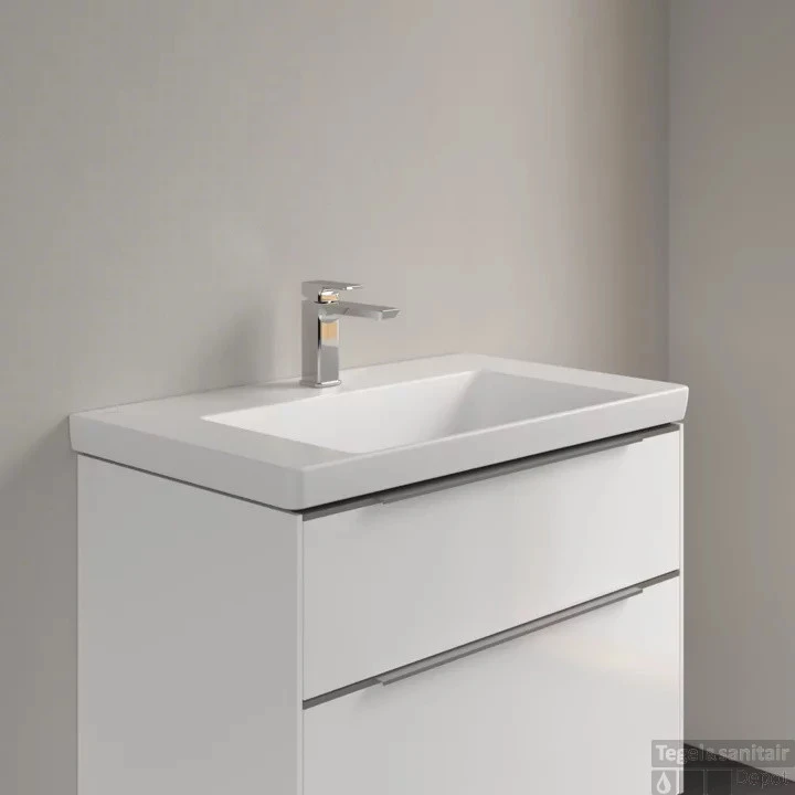 De wastafel is 80 cm breed, 47 cm diep en 16.5 cm hoog en is gemaakt van TitanCeram. Dat is een duurzaaam materiaal dat door Villeroy & Boch zelf wordt gecreëert door verschillende grondstoffen te versmelten. Het is extra stevig waardoor de wastafel lang mee gaat. Het diepe bekken zorgt er ook nog eens voor dat er genoeg ruimte is om handen te wassen.