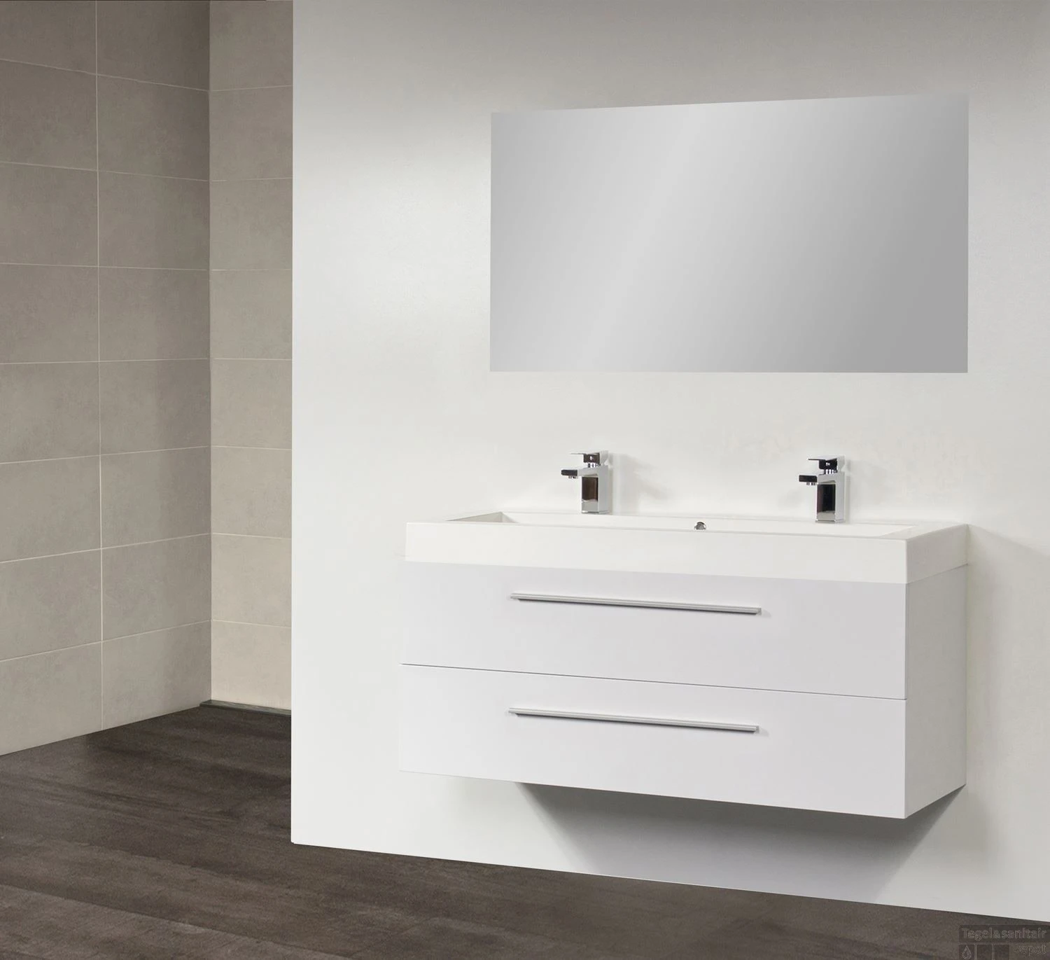 Het Florence wastafelblad is uitgevoerd in wit hoogglans gepolijst mineraalmarmer. De wastafel is 119.6 cm breed, heeft een rechthoekig wasbak met een overloop en twee kraangaten. Verder geven de 9.5 cm hoge rand en hoekige vormen de wastafel een moderne look.
